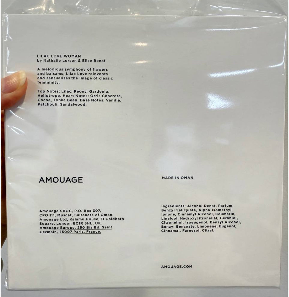 Amouage Lilac Love is a luxurious, romantic fragrance that captures the essence of modern femininity. Opening with an exquisite bouquet of lilac, jasmine, and gardenia, the scent unfolds into a warm heart of cocoa, orris, and tonka bean. The base lingers with creamy vanilla, sandalwood, and patchouli, leaving a sensual and sophisticated trail. A perfect signature for women who embrace elegance and charm.